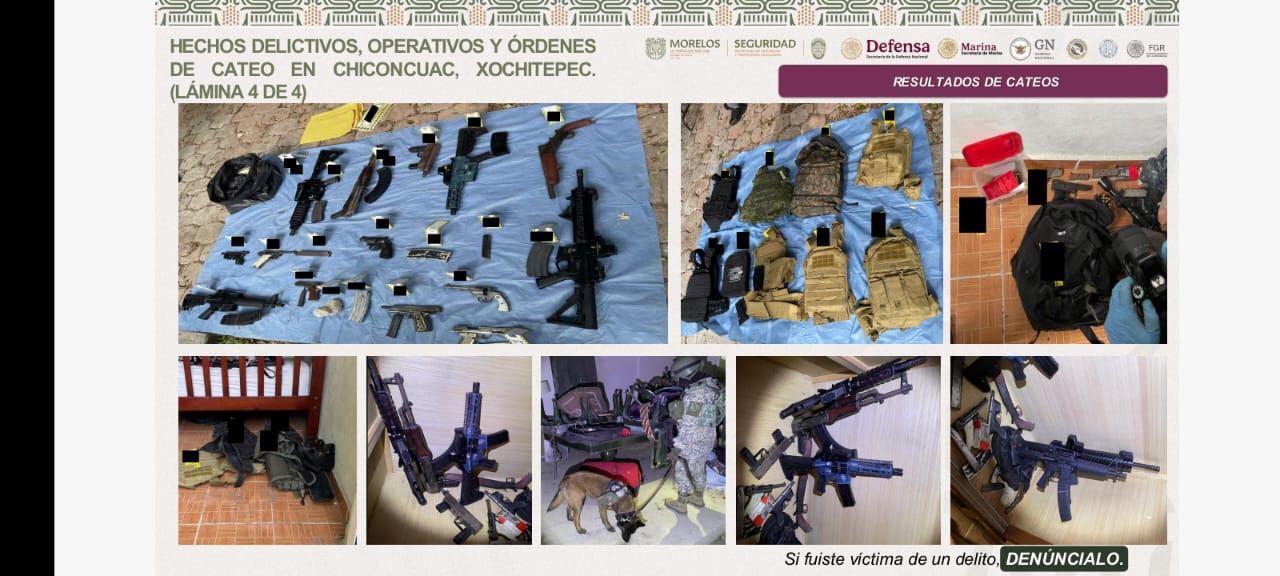 Elementos de la Fiscalía General del Estado, en colaboración con fuerzas federales, cumplimentaron seis órdenes de cateo en inmuebles de Chiconcuac, Xochitepec, donde aseguraron armamento y droga, pertenecientes a una célula de la “Unión Morelense” encabezada por Mario “N” o “Don Mario”.